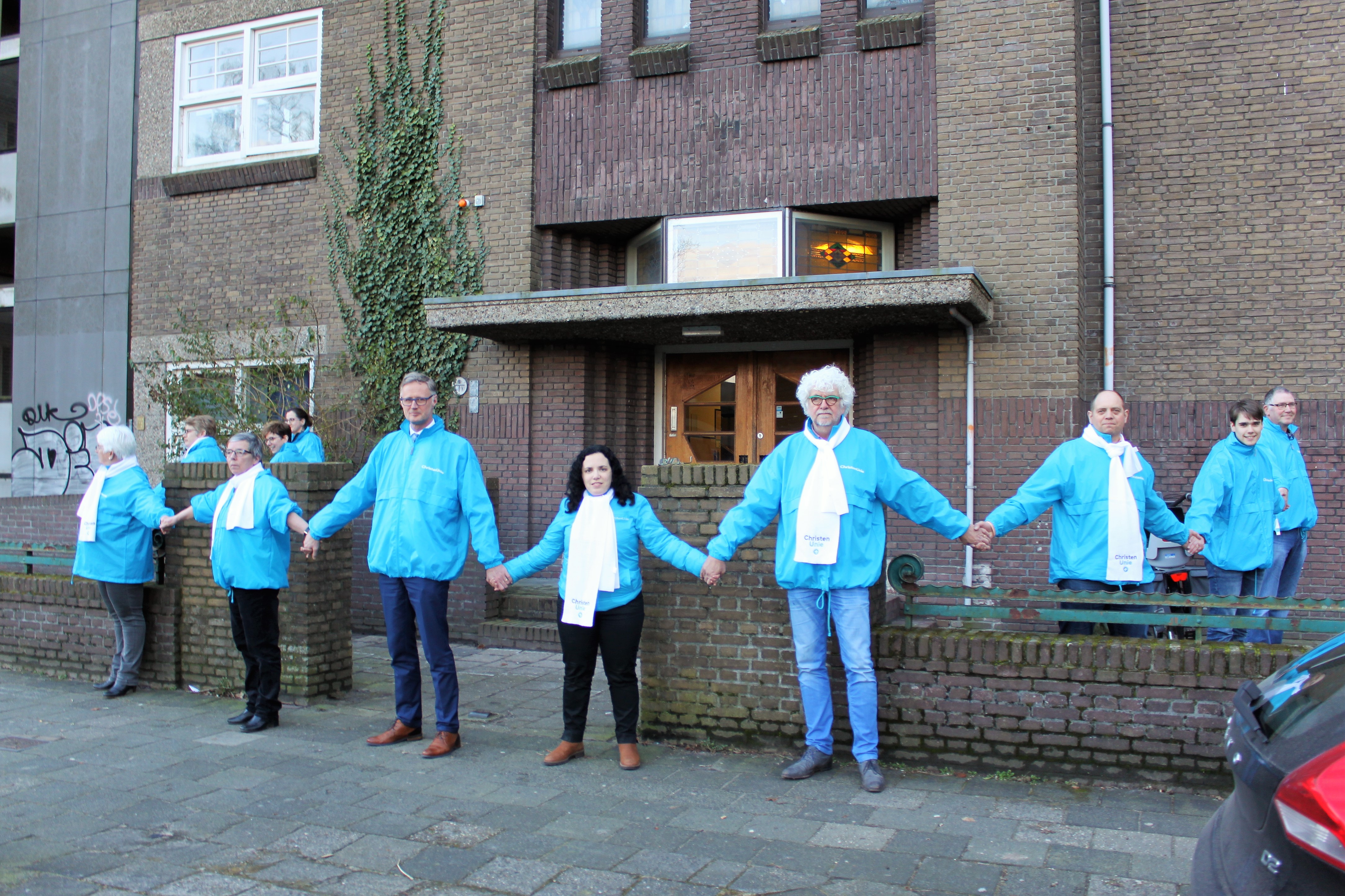De fractie zette haar standpunt kracht bij door met haar campagneteam een beschermende menselijke ketting rond de ingang van de school te formeren.